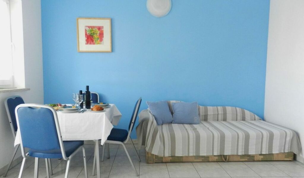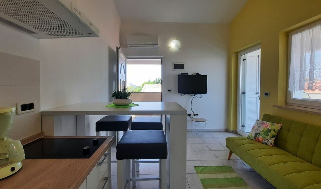 Diese klimatisierte Wohnung verfügt über eine möblierte Terrasse, ein Sofa, einen Flachbild-Satellitenfernseher und eine Küche mit einem Essbereich. Das Badezimmer mit einer Badewanne umfasst einen Haartrockner und eine Waschmaschine.