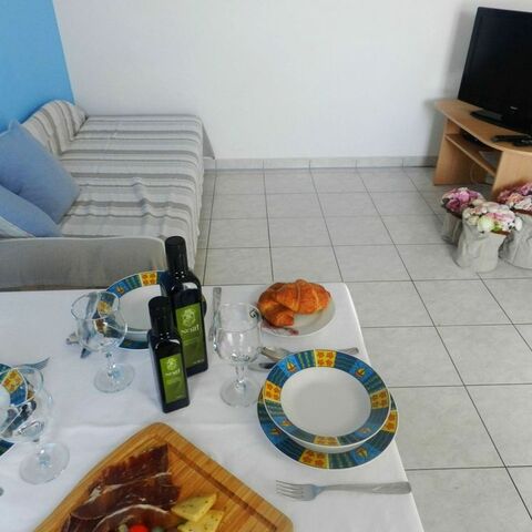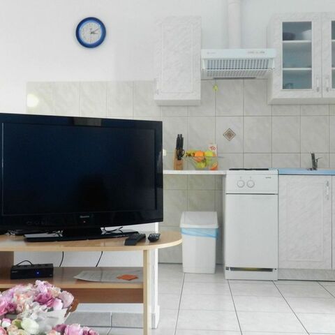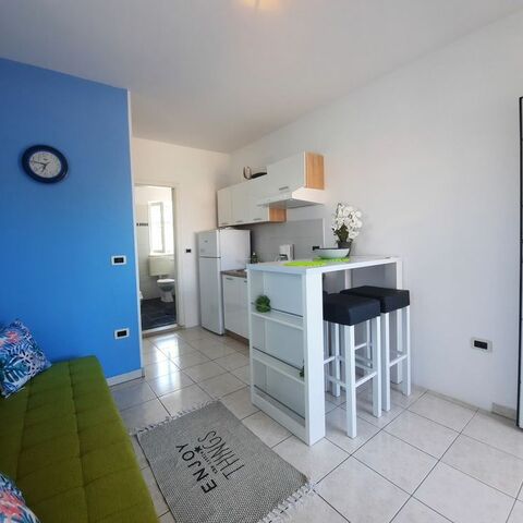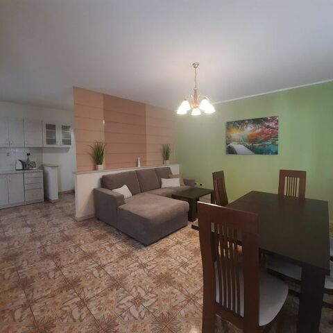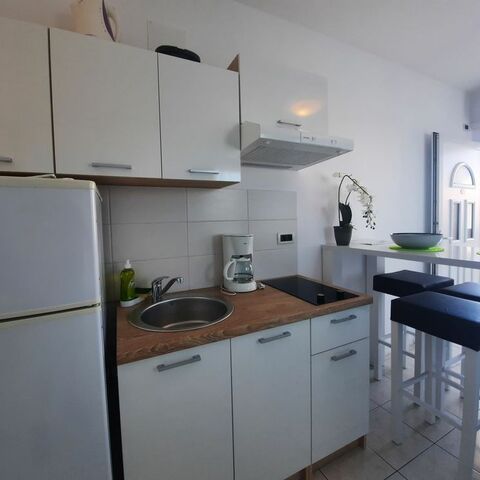 Diese klimatisierte Wohnung verfügt über eine möblierte Terrasse, ein Sofa, einen Flachbild-Satellitenfernseher und eine Küche mit einem Essbereich. Das Badezimmer mit einer Badewanne umfasst einen Haartrockner und eine Waschmaschine.